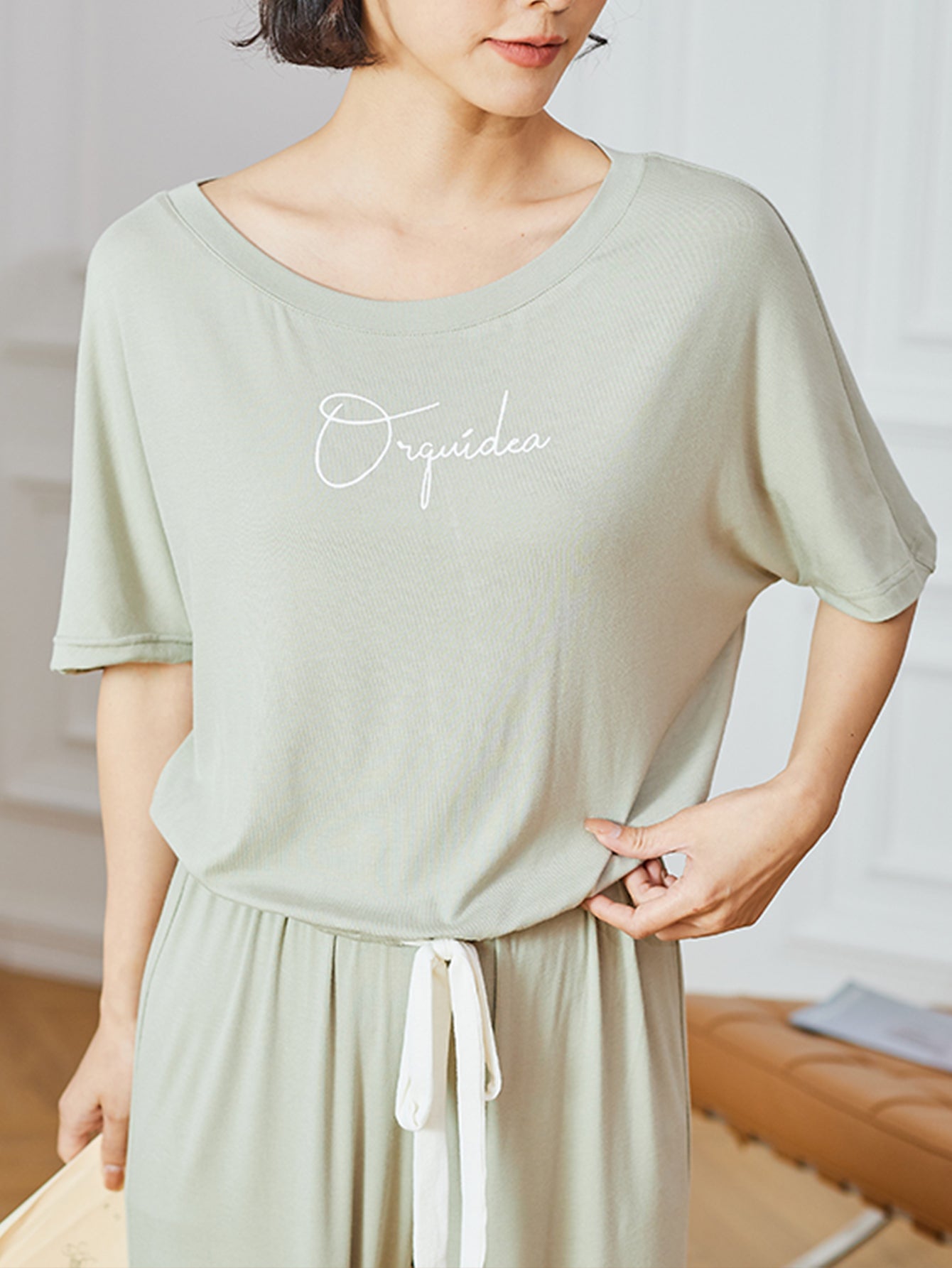 - ♥2PCS pajama set: short sleeves, Scoop-neck with pretty Printed Tie Drawstring closure top and elastic waist, full-length pants